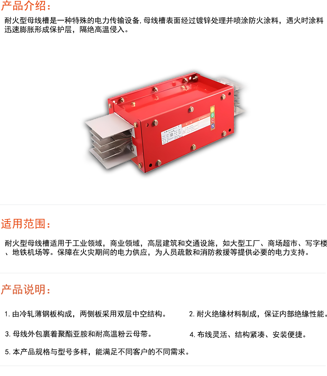 耐火型母线槽采用T2优质导电铜排,铜含量≥99.95%,电阻率≤0.01777Ω.MM2/M 。导体表面包缠3层以上云母带绝缘(耐热≥ 1100°C),导体与外壳间采用硅棉(耐热≥1600°C)隔热。外壳采用2.0以上优质钢板制作,外壳表面经除锈、除油、磷化烘干后静电喷涂耐火粉末,使外壳在火焰状态下不至于燃烧。外壳结构为内外槽形,